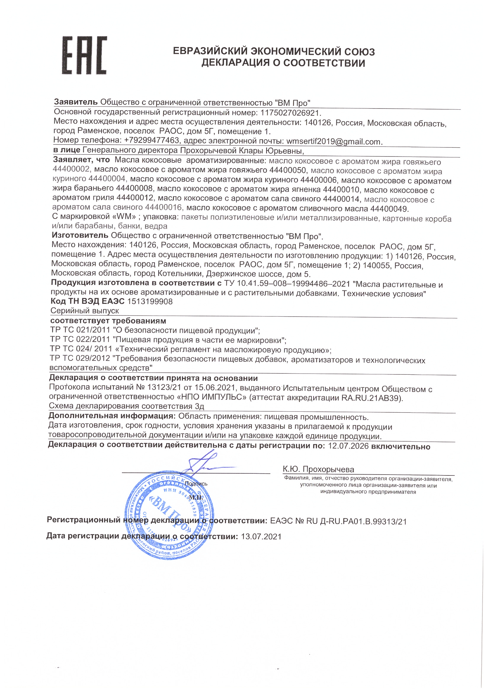 Масло кокосовое с ароматом жира говяжьего, 44400002